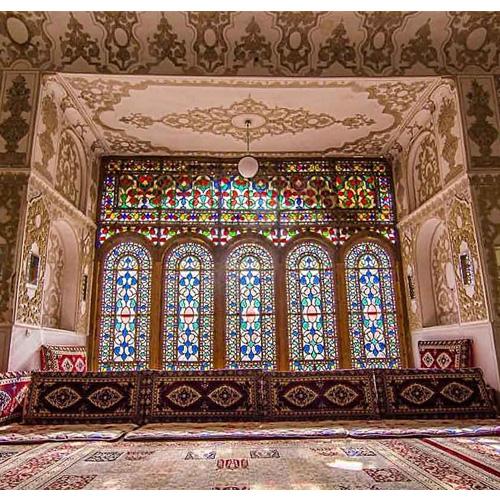 اگر به خوبی به این طبقه دقت کنید شاهد گچ بریهایی زیبایی میشوید که بر روی ستونها کار شده است. پنجرههای این اتاق به صورت ارسی میباشد که شیشههای آن رنگی کار شده و نور را به شکل زیبایی به داخل اتاق هدایت میکند.